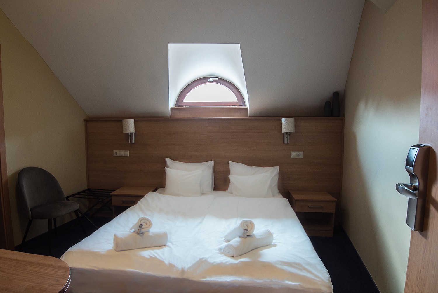 Manzárd kétágyas szobáinkhoz zuhanyzóval, illetve WC-vel felszerelt fürdőszoba tartozik. Hangulatos, tetőtéri szobáink a harmadik emeleten találhatóak.
