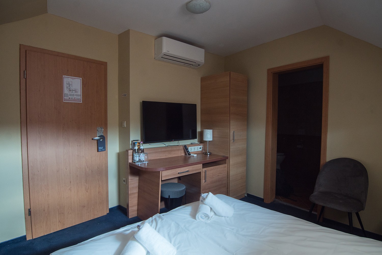 Szállodánk csendes kétágyas szobái légkondicionálóval, síkképernyős televízióval, valamint vezeték nélküli ingyenes internet hozzáféréssel rendelkeznek.