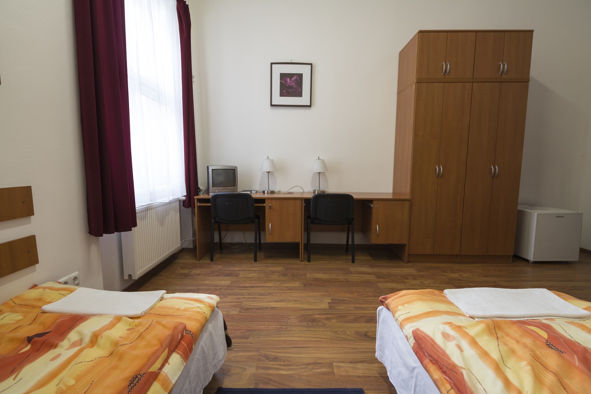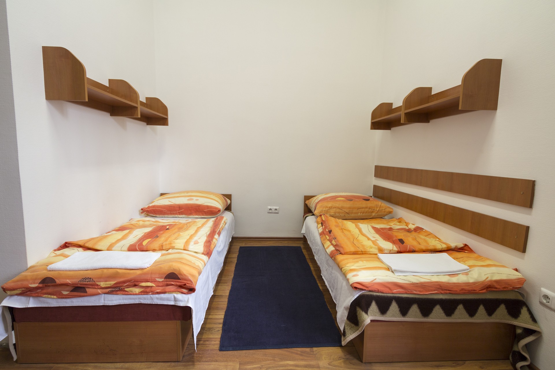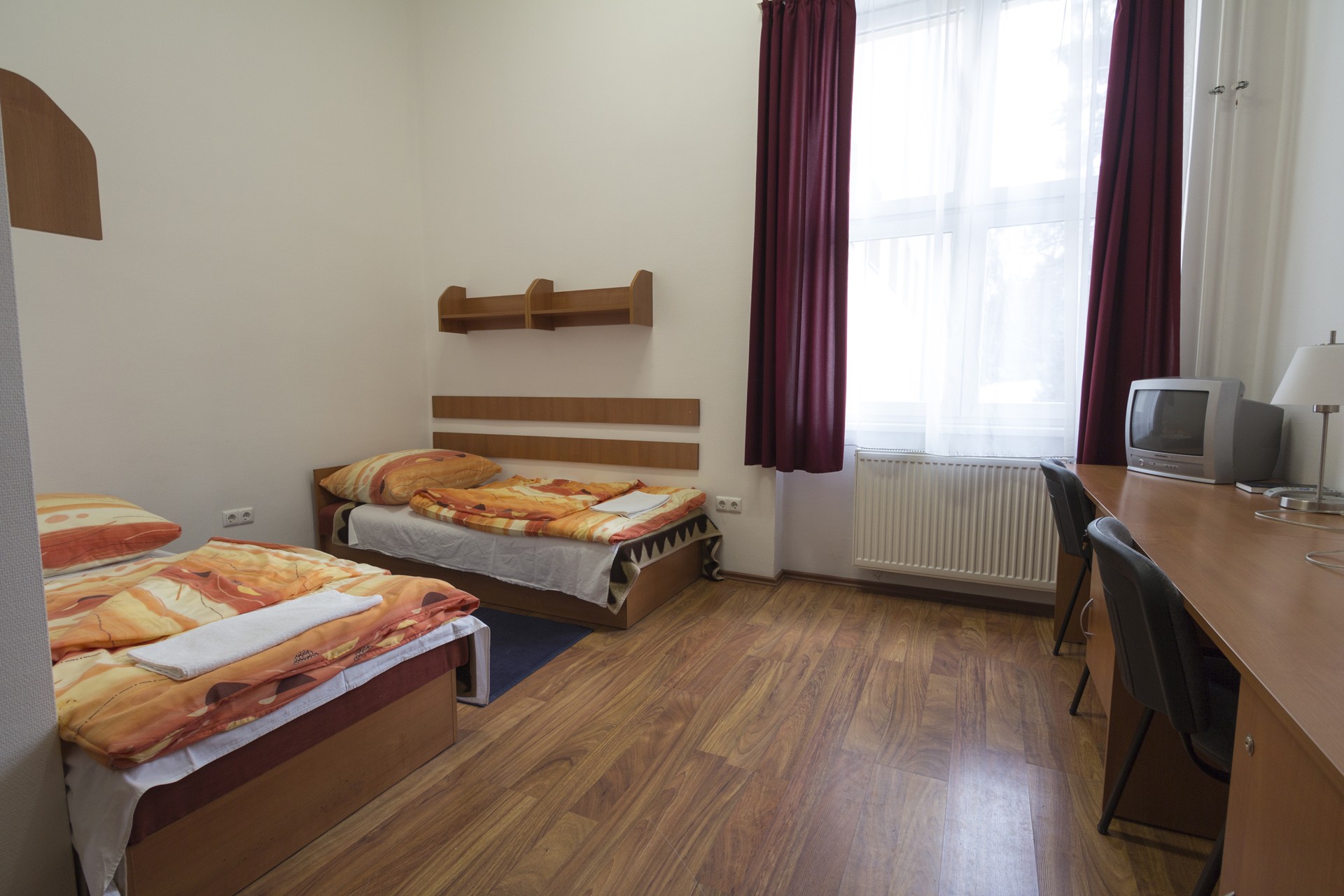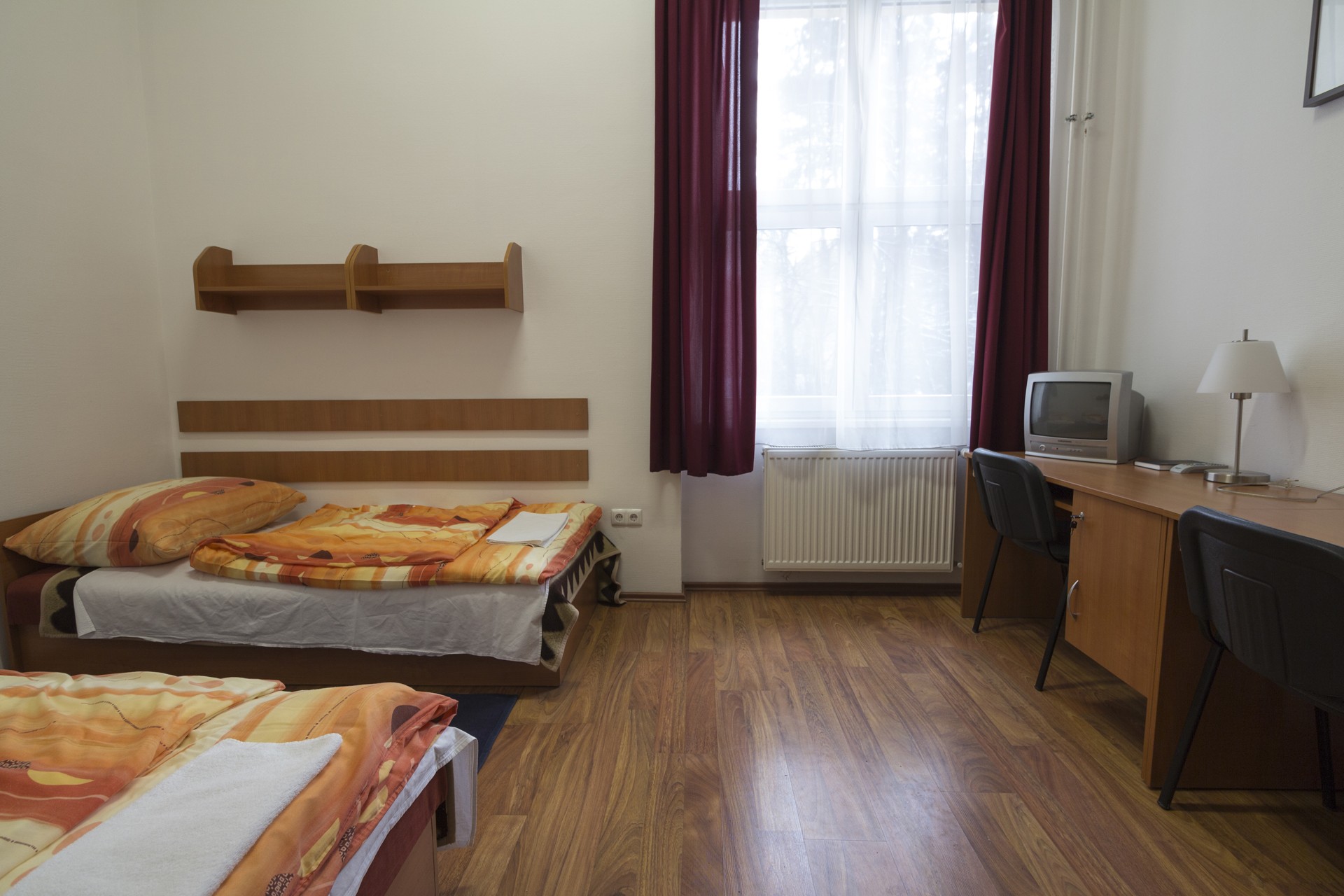 Egy darab kétágyas szoba egy kétszobás lakóegységben, melyek külön-külön is zárhatóak, szobánként két ággyal, két szekrénnyel, valamint ingyenes szélessávú internet-hozzáféréssel rendelkeznek, és tartalmaznak: * Közös előteret * Hűtőszekrényt * Fürdő-blokkot, mely zuhanyzóegységből és tisztálkodó egységből áll, * saját WC-vel!
